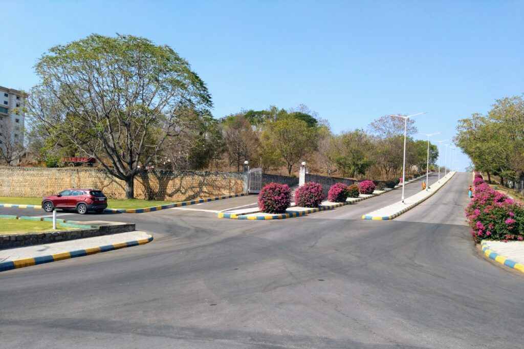 なお、ハイデラバード市内の道路とは様子が違います。実際の大通りはメトロ(高架)と並走していたり、高速(有料)道路だったりするし、なにより生活感がある。実際の道路は交通量が多すぎて撮影のために封鎖するのは現実的でないと思う。