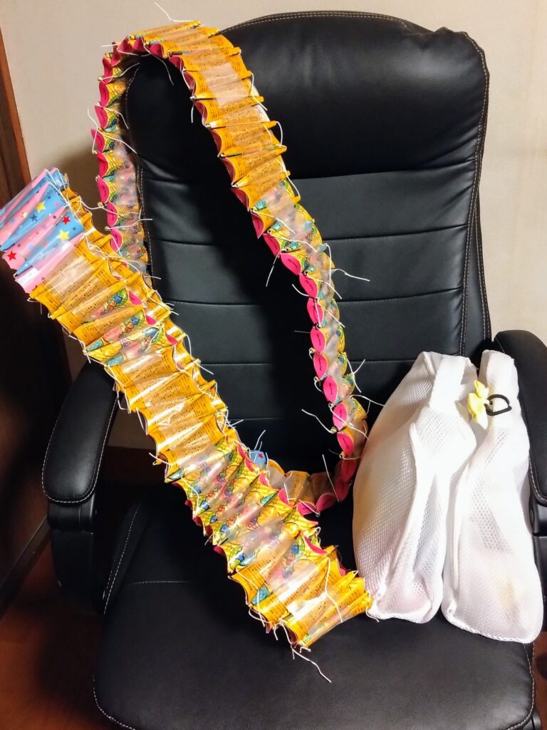 これはそのまま持っていくと扱いづらいので、90個ずつ養生テープで繋げました。肩にかけられるよ。